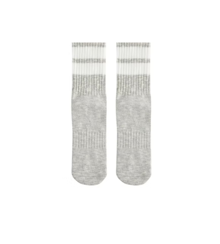 Esta calceta larga para dama en gris jaspeado claro destaca por su diseño clásico la parte superior: dos franjas gruesas en color blanco creando un contraste.